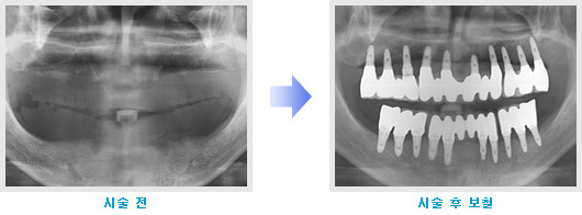 • 자연 치아가 충치, 잇몸 질환, 사고 등의 이유로 모두 상실된 경우에 원래 자연 치아처럼 모두 재현해 드릴 수 있는 임플란트 시술 방법입니다.